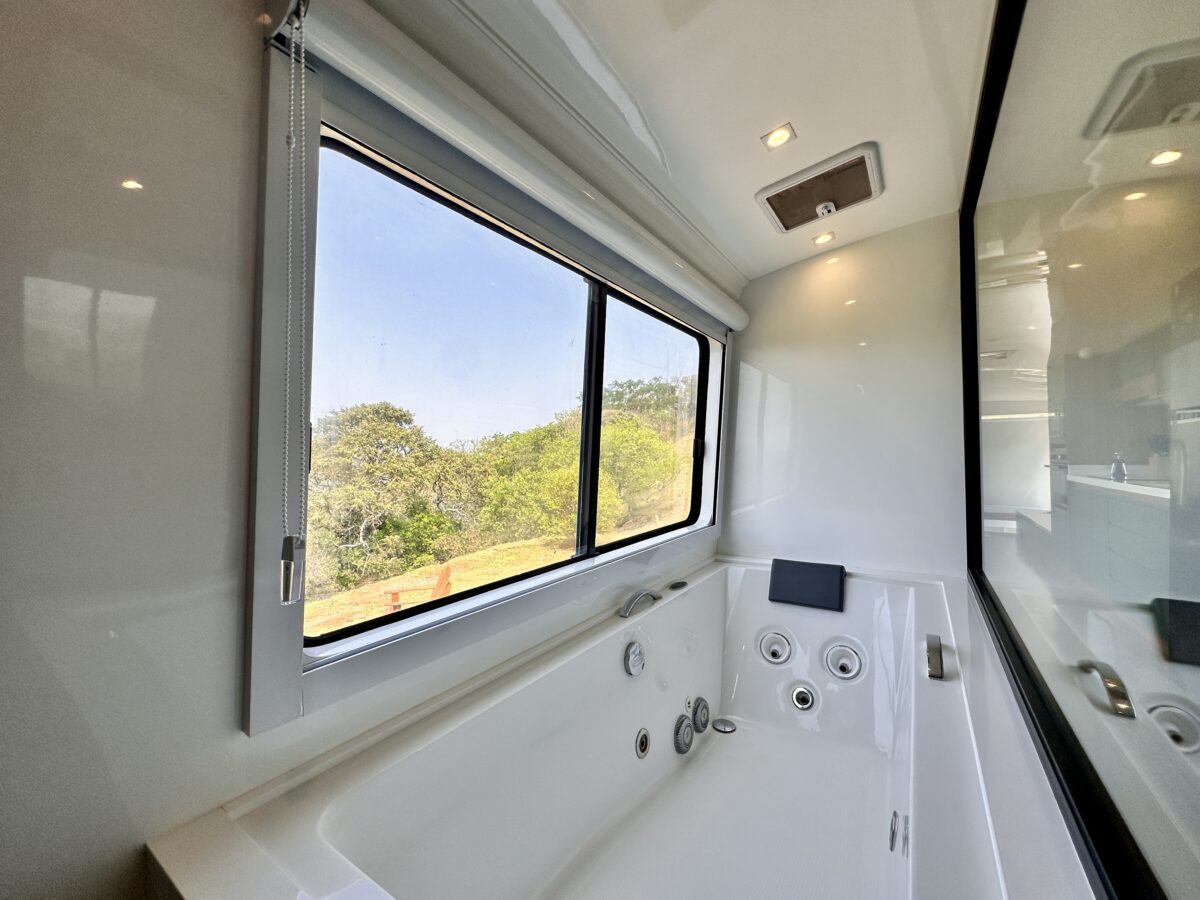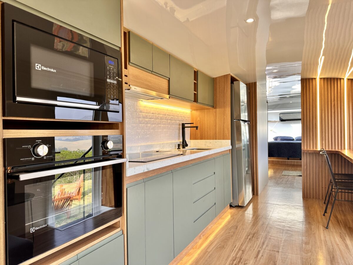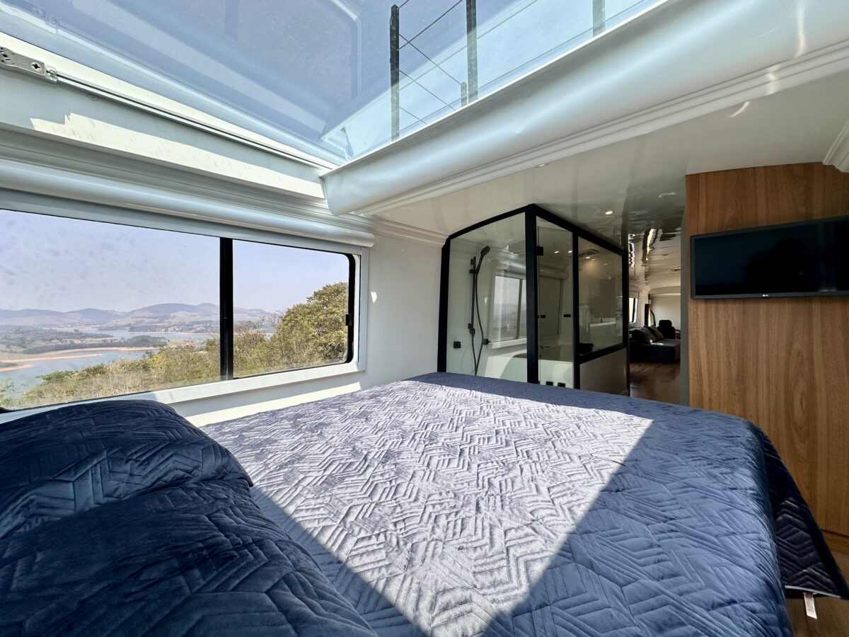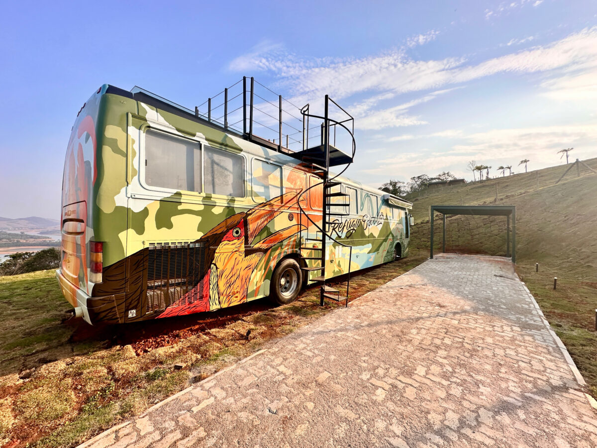 O ambiente é privativo e oferece para o casal o conforto de uma cama com teto solar equipada com blackout retrátil elétrico, permitindo que você durma sob o céu estrelado. Além disso, o ônibus conta com uma jacuzzi interna, ideal para relaxar em meio à natureza. Um refúgio perfeito para momentos de paz e conexão interior.