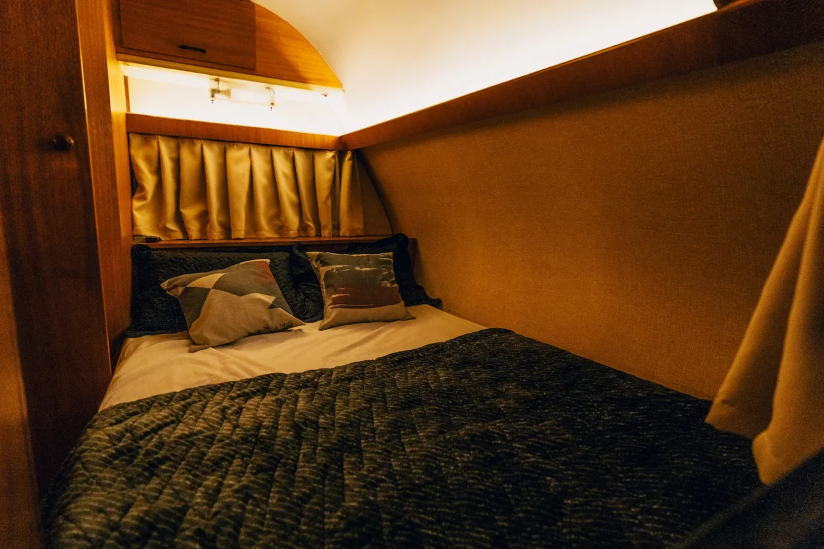 O banheiro é pequeno mas adorável, no chuveiro uma clarabóia que permite uma conexão visual com a copa das árvores. Um dos cantinhos mais aconchegantes é o quarto com uma cama confortável e uma smart TV 24 polegadas.